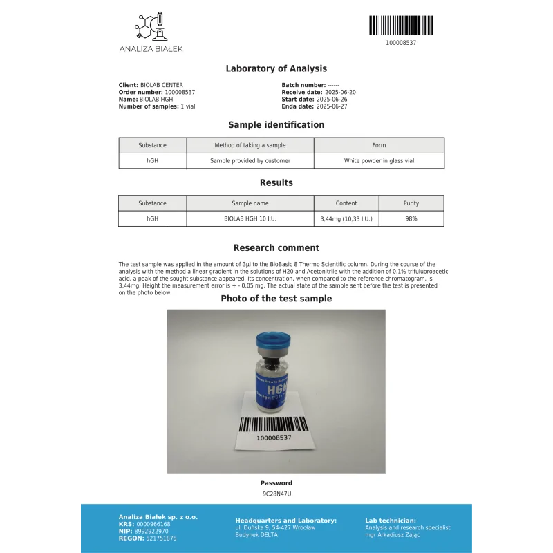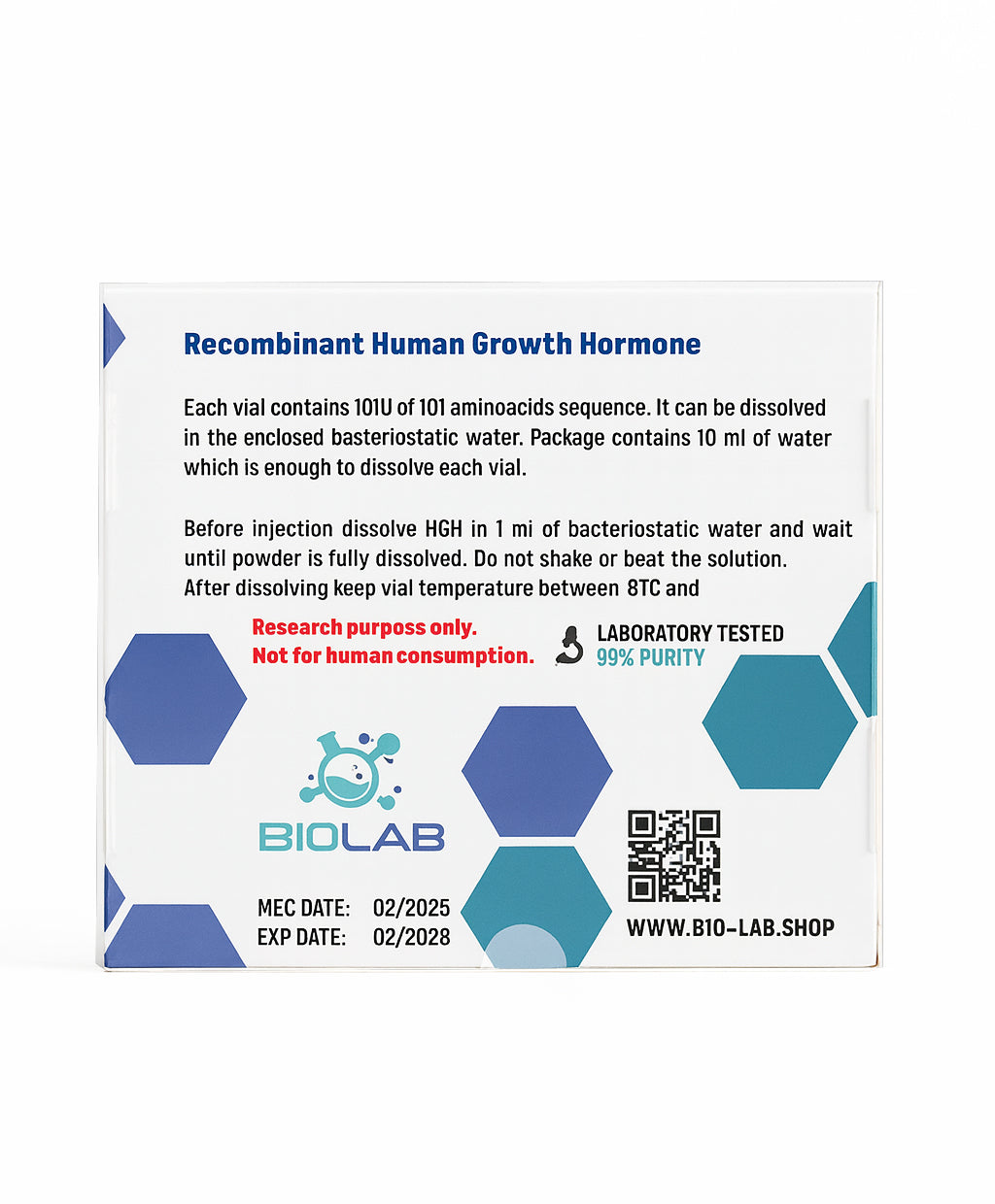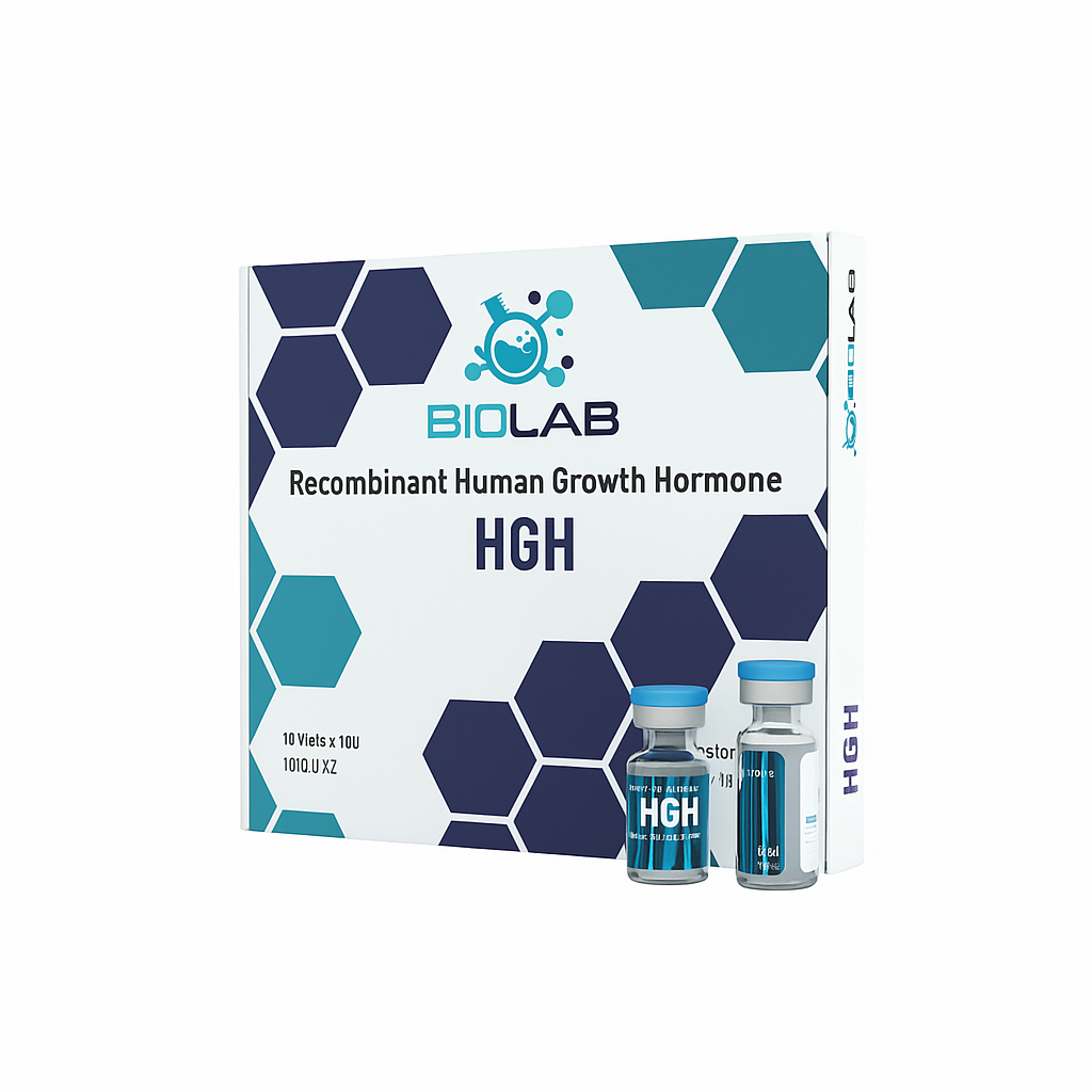 HGH (Human Growth Hormone) 10x10IU is a high-purity, recombinant form of Somatropin, a synthetic analog of endogenous human growth hormone. Each vial contains 10 IU (International Units), and the package includes 10 sterile vials – ideal for consistent and controlled experimental applications in research settings.