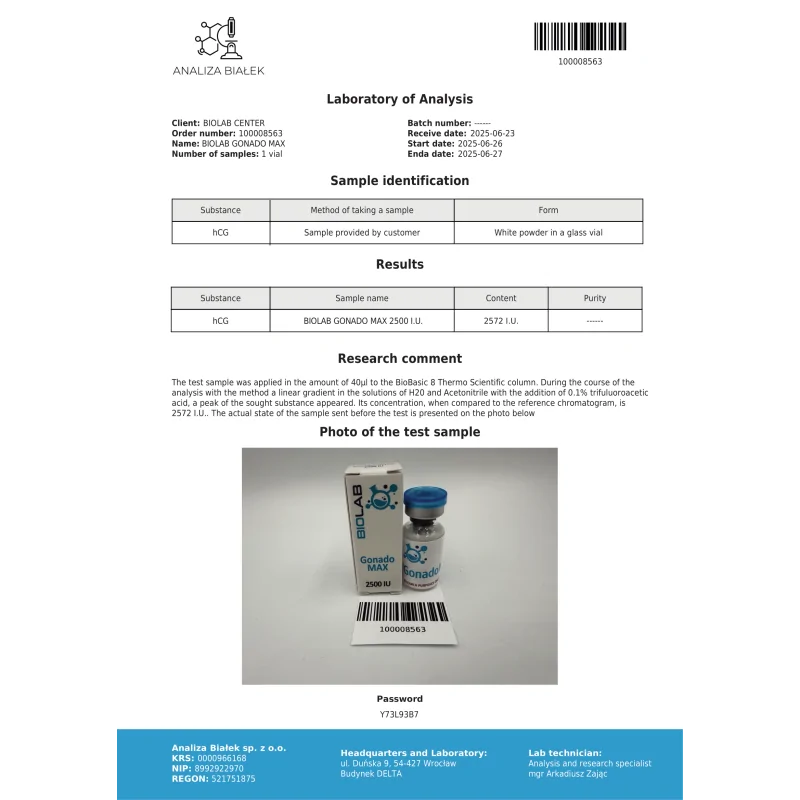 GonadoMax 2500 IU contains high-purity Chorionic Gonadotropin (hCG), a glycoprotein hormone widely used in scientific and clinical research for its role in reproductive function, endocrine modulation, and luteinizing hormone (LH) mimicry. Each vial delivers 2500 IU of biologically active hCG, formulated for precise and consistent application in laboratory settings.