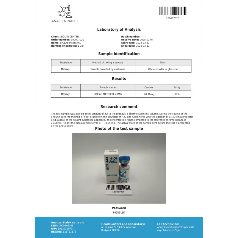 Matrixyl works by stimulating the growth of new collagen, elastin and hyaluronic acid, which help to naturally fill in fine wrinkles from within the skin. Matrixyl, scientifically named palmitoyl pentapeptide-4, is a safer and more effective anti-aging ingredient than retinol, it works faster than retinol, but does not irritate the skin. This ingredient not only prevents wrinkles, but also moisturizes the skin, preventing it from drying out, mimicking the action of "matrykines" - naturally occurring peptides (short chains of amino acids) that are bound to our collagen fibers. As we age, our collagen fibers gradually break down, allowing matrykines to be released from their binding site. Free matrykines can bind to fiber-producing cells (called fibroblasts) to trigger and stimulate the production of new, young and healthy fibers, mainly collagen and elastin, which provide firmness and elasticity to the skin. Matricins also stimulate the production of hyaluronic acid, a key molecule that keeps the skin well-hydrated and filled out. Aging skin releases less matrykines over time, meaning that our skin breaks down from the inside out without adequate replenishment of the fibers.Matrixyl provides a much-needed boost of matrykines to aging skin, allowing young and healthy cells to return to function, stimulating collagen renewal and promoting skin rejuvenation. One study involving 28 women showed that after just 2 months of Matrixyl use, the volume of deep wrinkles was reduced by 45% and skin tone increased by almost 20%. Another study involving a group of men showed a 17.1% reduction in wrinkle volume and an overall improvement in the number of wrinkles by 30% after 2 months of daily use. More recent data show a significant increase in the thickness of the papillary layer of the dermis after 1 month of use and Matrixyl's ability to delay photoaging by 5.5 years after just 2 months of use.