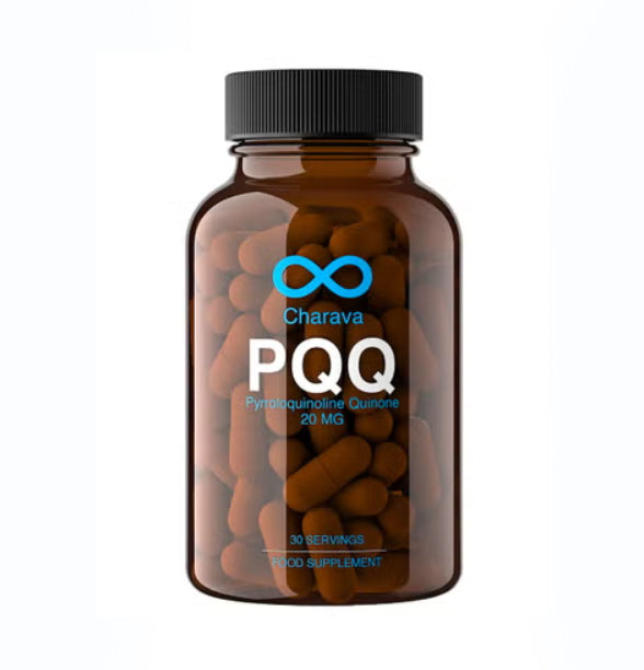 Charava PQQ (Pyrroloquinoline Quinone) is a food supplement that contains 20mg of Pyrroloquinoline Quinone per serving which has potential health benefits, supporting healthy cellular function, boosts energy feels more vibrant and focused. Pyrroloquinoline Quinone (PQQ) is a powerful, naturally occurring compound that has gained significant attention for its potential health benefits. Found naturally in kiwi fruit, natto (fermented soybeans), and even green tea, PQQ boasts a unique ability to act as both an antioxidant and a coenzyme. Known for its role in cellular energy production and mitochondrial health, PQQ is an essential supplement for those looking to enhance their overall well-being. PQQ promotes the generation of new mitochondria within cells, leading to increased energy levels and improved vitality. This mitochondrial biogenesis is crucial for maintaining optimal cellular function, particularly in high-energy organs such as the brain and heart. Additionally, PQQ’s potent antioxidant properties help protect cells from oxidative stress and damage, supporting long-term health and slowing the aging process. Taking 20mg of PQQ per day ensures you receive a therapeutic dose that maximizes its health benefits. This dosage has been shown to significantly improve cognitive function, memory, and focus by supporting brain health and neuroprotection. Furthermore, PQQ can enhance cardiovascular health by reducing inflammation and oxidative damage, potentially lowering the risk of heart disease. Incorporating a 20mg PQQ supplement into your daily routine can also improve sleep quality by regulating cortisol levels, the body’s primary stress hormone. By enhancing your body’s natural sleep cycles, PQQ helps ensure restorative and uninterrupted sleep, contributing to overall wellness. It protects brain cells from oxidative damage and inflammation, which are implicated in neurodegenerative conditions such as Alzheimer’s and Parkinson’s diseases. It may help reduce risk factors for heart disease by lowering blood pressure, improving lipid profiles. Charava PQQ (Pyrroloquinoline Quinone) 20mg is a comprehensive approach to boosting energy, brain function, cardiovascular health, and overall vitality. Made from HPMC (hydroxypropyl methylcellulose), a plant-based material suitable for vegan and vegetarian diets.