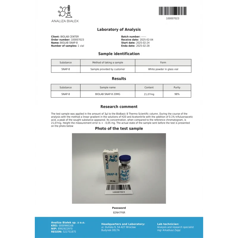 SNAP-8 is a unique neuropeptide that has one overriding purpose - expression lines. This product has been tested in terms of reducing wrinkles. Scientists have proven that when used regularly, it reduces skin folds by up to 60%. Known and used for a long time in creams and cosmetic cheeses.